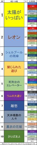 【お気に入りフランス映画】「投票」結果の「トップ10」です。 1位は「太陽がいっぱい」の圧勝劇でした。7年前の投票でも1位。15人中、9人が投票しました。不動の指定席と言えそうです。特に今回は10点を献上したのがモモタロウさん、猫姫さん、およやんさ…