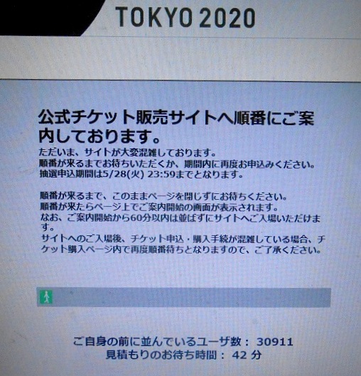 2019-05-10 ★「TOKYO2020」チケット購入は相当待ちそう。「私、待つわ♪」(笑)。 東京オリンピックの入場券を購入するためには、まず「ID」登録が必要。「ID」登録が終わると、抽選に応募しなければならない。抽選に申し込むまでに、「お待ち時間」の時間、待たなくてはならない。とりあえず申し込んだら、待ち時間は「42分」。 ♪わ・た・しぃ~、待つわ♪ いつまでも待つわ。たとえオリンピック事務局が振り向いてくれなくても♪ 待つわ。♪ youtu.be あと5分なら「待つわ。」(笑)。